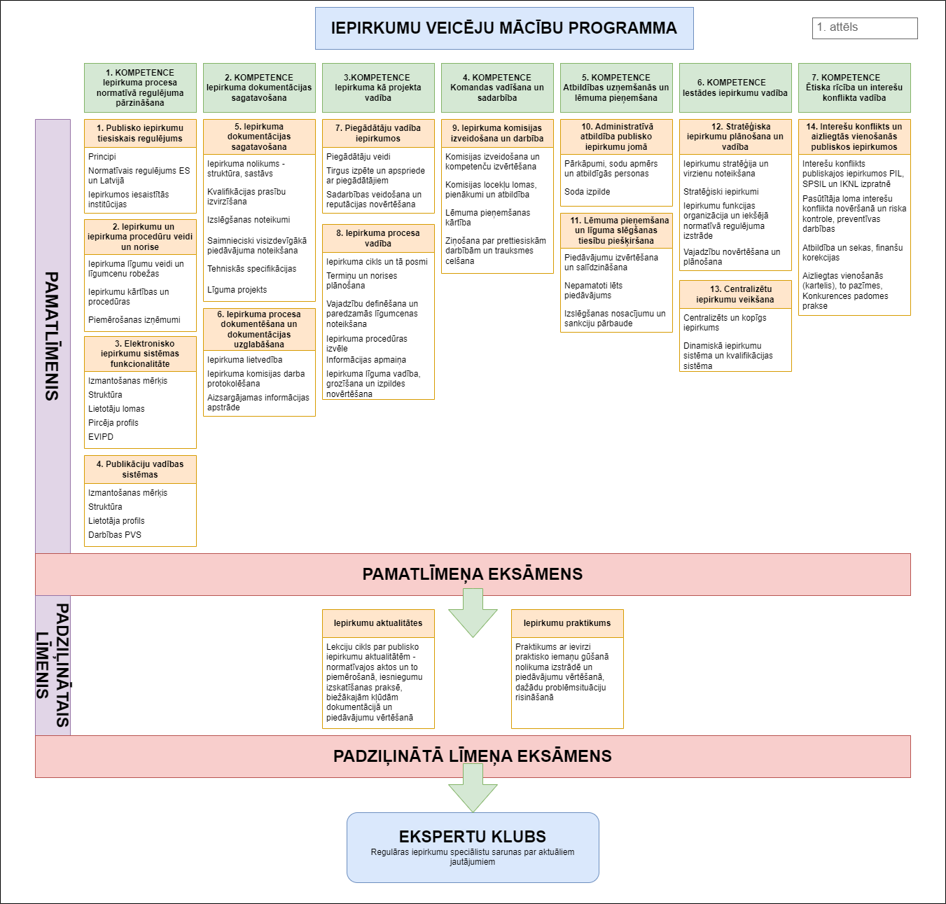 2021. gadā Valsts administrācijas skola sadarbībā ar Iepirkumu uzraudzības biroju izstrādāja Profesionālo kompetenču un potenciāla novērtēšanas un cilvēkresursu attīstības plānošanas matricas un to piemērošanas vadlīnijas iepirkumu speciālistu amatu grupai. Savukārt 2022. gadā Eiropas Savienības Atveseļošanas un noturības mehānisma plāna 6.4.3. reformas “Profesionalizācijas stratēģijas izstrāde un īstenošana” ietvaros tās papildinātas ar paaugstinātas kompetences prasībām (kompetenču pazīmēm) lielo (virs Ministru kabineta noteiktajiem līgumcenu sliekšņiem) un centralizēto iepirkumu veicējiem. Kompetenču matrica veidota, balstoties uz Eiropas Komisijas izstrādāto ProcurCompEU. Uz kompetenču modeļa pamata izstrādāta mācību programma iepirkumu speciālistiem (Valsts administrācijas skolas platformā), kurā iespējams apgūt mācību moduļus, ņemot vērā kompetenču matricā noteiktās vajadzības.