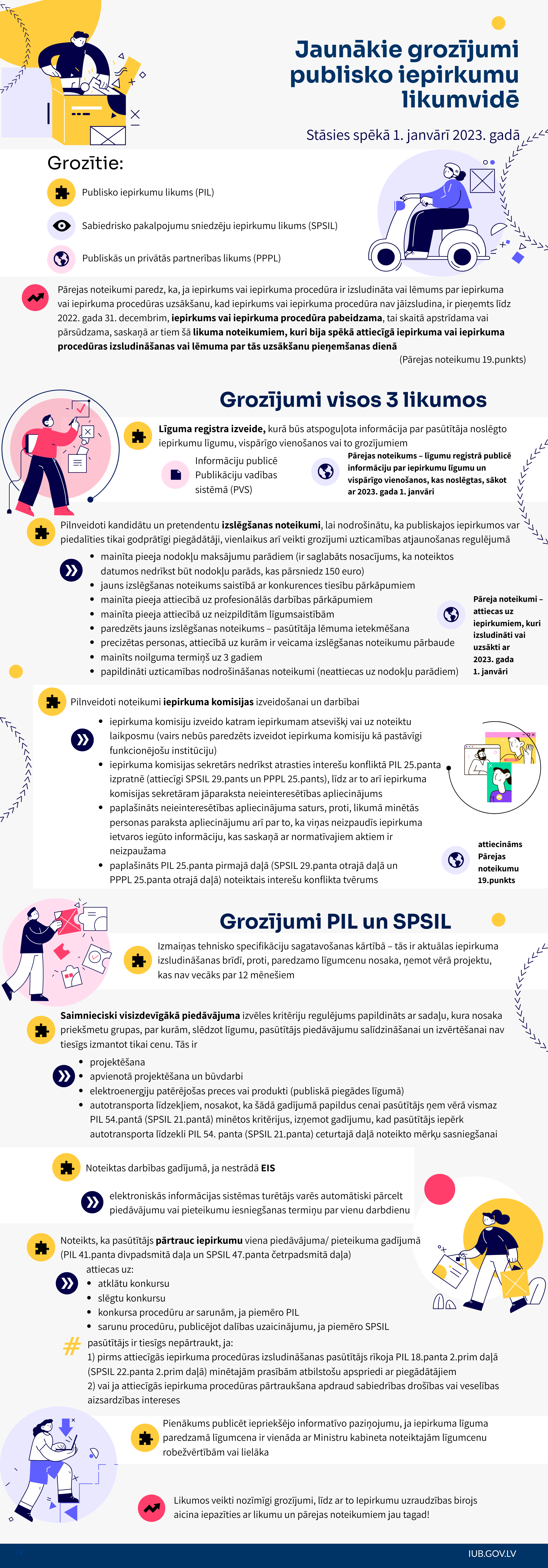Atgādinām, ka 2023.gada 1.janvārī spēkā stājas ļoti apjomīgi grozījumi publisko iepirkumu likumvidē un pamatā skars Publisko iepirkumu likumu un Sabiedrisko pakalpojumu sniedzēju iepirkumu likumu.
